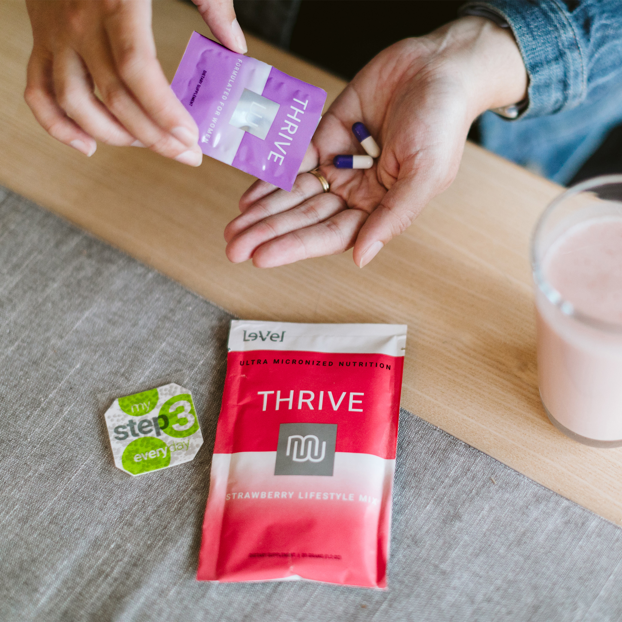 Follow the 3-step THRIVE Classic Experience every morning for maximum benefits. Step 1: First thing in the morning, take your premium Lifestyle Capsules with a glass of water. Step 2: 20-40 minutes later, shake up your Lifestyle Mix with water, juice or in a smoothie and enjoy. Step 3: Lastly, apply your DFT to clean, dry skin and leave it on for 24 hours.